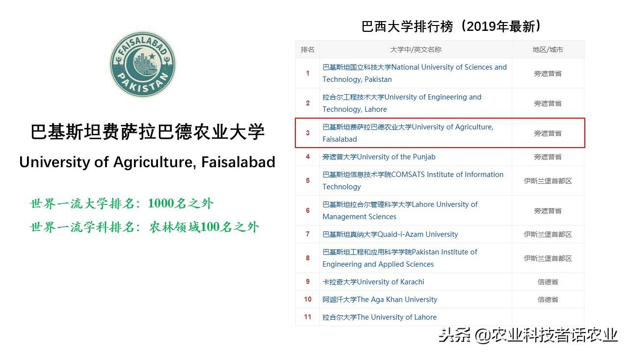 巴基斯坦费萨拉巴德农业大学(University of Agriculture, Faisalabad)成立于1906,是一所公立研究型综合大学。费萨拉巴德农业大学拥有农学院、兽医学院、科学技术学院、 畜牧学院 、农业工程技术学院、食品科技学院,土壤与环境科学研究所、 园艺科学研究所、动物营养与饲料科技研究所、 微生物研究所、企业管理研究所、 农业推广和农村发展研究所、农业和资源经济研究所等院所机构。