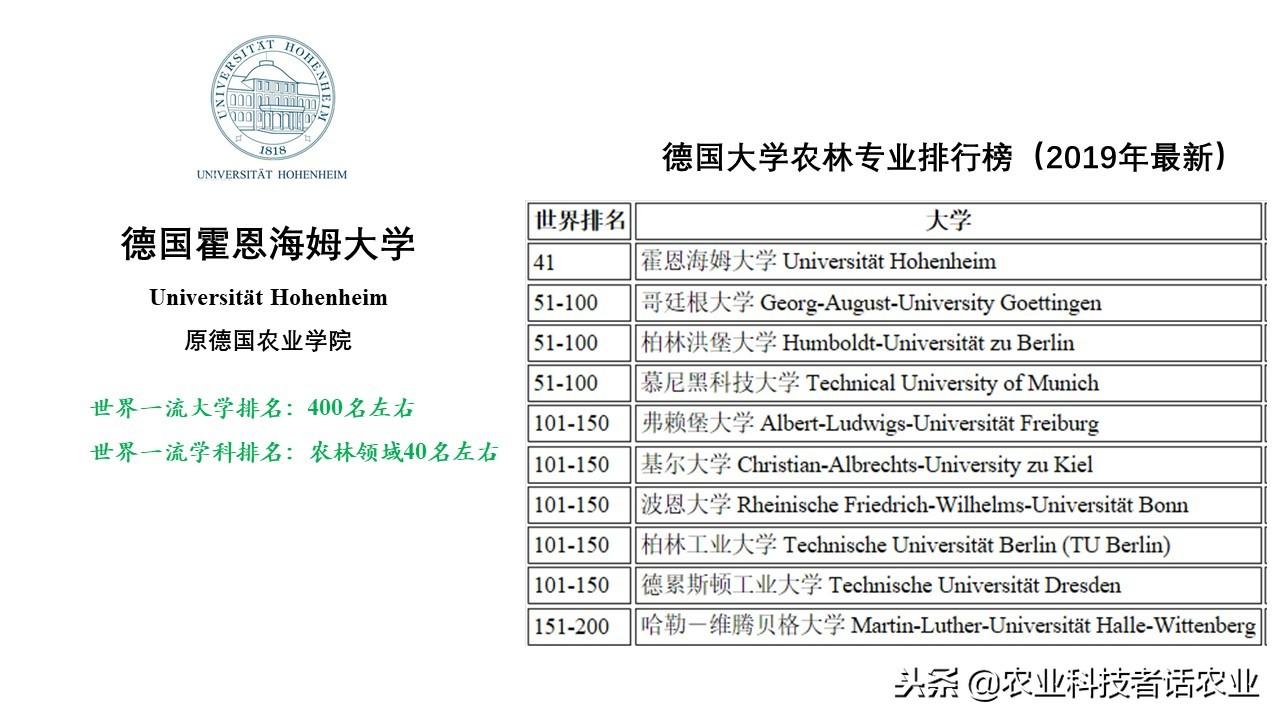 德国霍恩海姆大学(Universität Hohenheim)历史悠久。霍恩海姆大学始建于1818年,为一所小型的农业学院; 1904改名扩建成为德国国立农业学院;1967年,改为现有的霍恩海姆大学。霍恩海姆大学以农业科学为教育和科研重点,其农业科学在德国排名第一,是欧洲著名的农学学府,同时在在世界农业院校中也久负盛名。