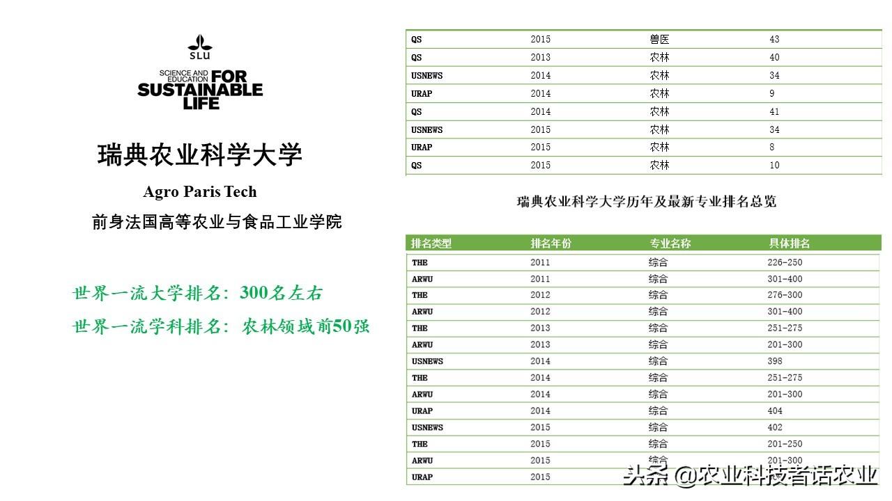 瑞典农业科学大学(Swedish University of Agricultural Sciences,简称SLU)成立于1977年,它由3个独立的学院组成:动物医学院、林业学院和农业学院。其前身是1775年成立的瑞典卡拉兽医院、1813年成立的瑞典皇家农学院和1828年成立的瑞典斯德哥尔摩林学院。瑞典农业科学大学是瑞典唯一的农业专门院校。