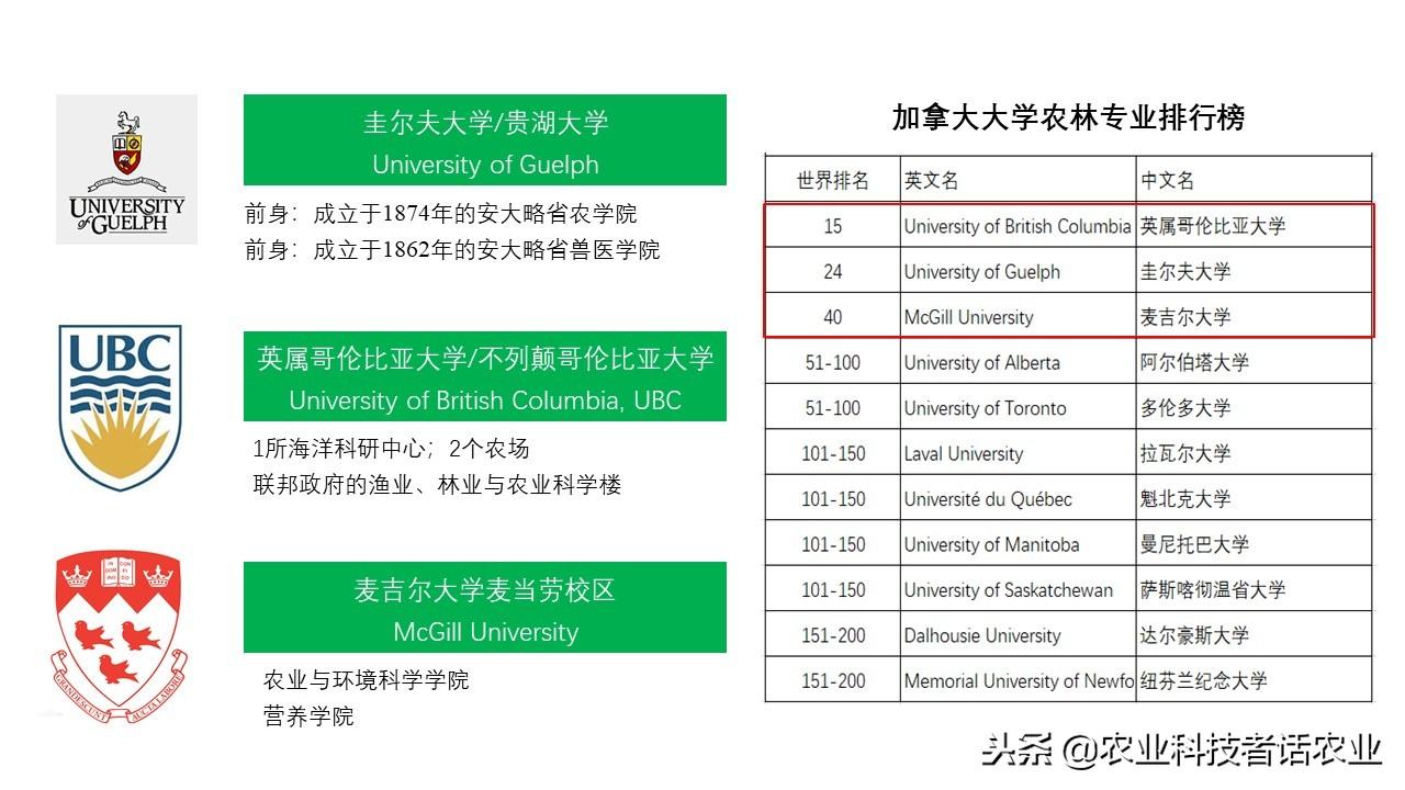 加拿大有三所知名的涉农大学:圭尔夫大学、英属哥伦比亚大学和麦吉尔大学。这三所大学在世界农林专业排行榜中均长期位于世界前50强。其中,圭尔夫大学前身是成立于1874年的安大略省农学院和成立于1862年的安大略省兽医学院。