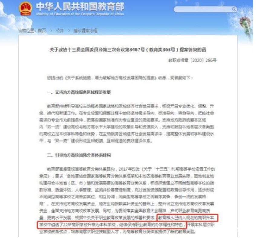 但是随着教育制度改革的不断推进,很多职业院校也有机会进入本科行业,教育部最新通知中,就有22所职业学院将破格升为本科院校,对于考生来说是一个好机会。