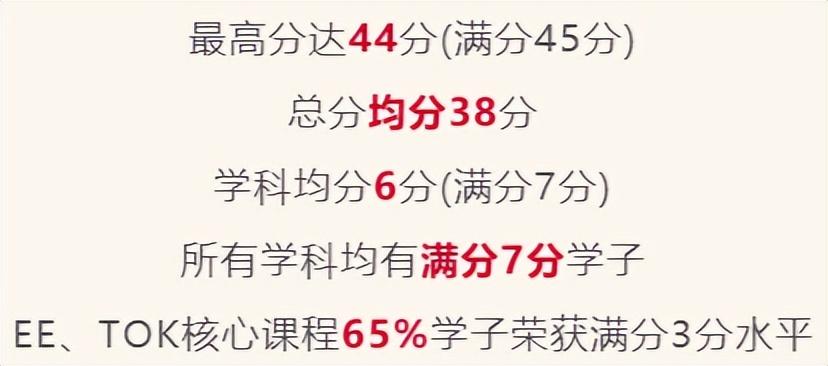 在2022年5月的IB全球统考中,句容碧桂园学校学生平均分为38分,最高分为44分,学科均分为6分,所有学科均有满分7分学生。