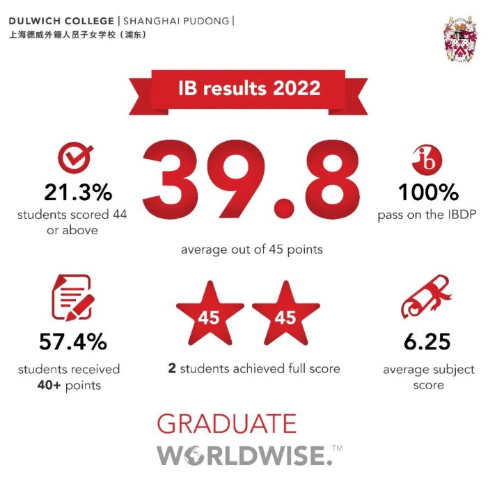 在2022年5月的IB全球统考中,上海德威外籍人员子女学校-浦东学生平均分为39.8分,2名学生获得45分满分,文凭通过率为100%。