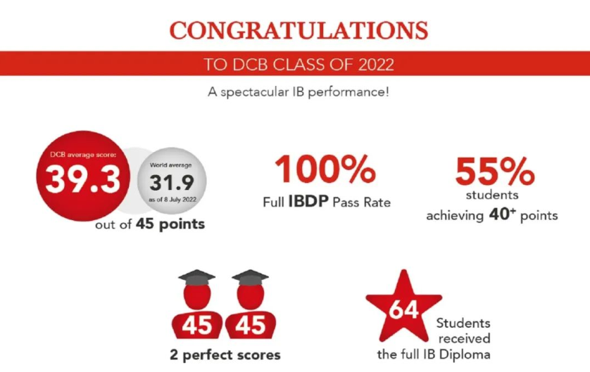 在2022年5月的IB全球统考中,北京德威英国国际学校学生的平均分高达39.3分,远远高过世界均分31.9分。55%的毕业生IB成绩高于40分,其中包括2名45分满分的学生。64位学生获得IB文凭,达到了100%的IB DP通过率。