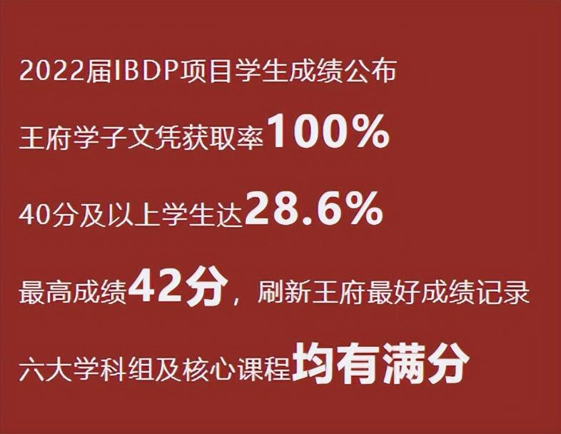 在2022年5月的IB全球统考中,北京王府学校学生平均分为37.33分,文凭通过率为100%。28.6%的学生获得了40分及以上的优异成绩,其中,最高成绩42分,刷新了学校最高成绩纪录。