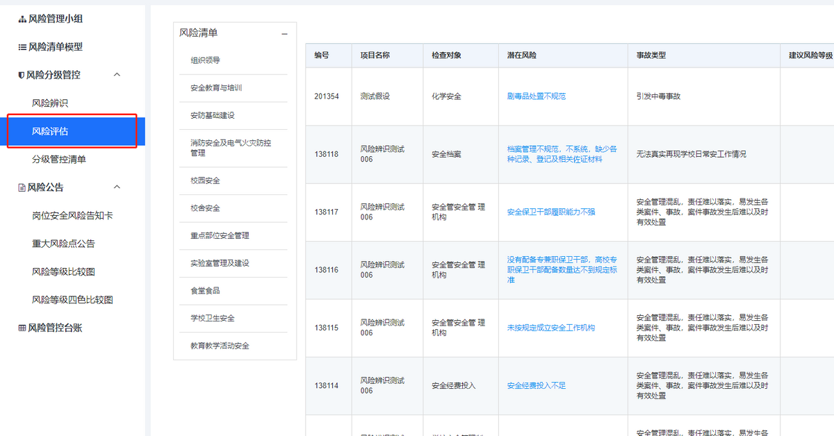 安全风险评估系统又名风险双重预防和评估系统,即学校安全风险辨识管控与隐患排查治理双重预防体系两道防火墙(紧箍咒)构成双体系,第一道:以安全风险辨识和管控为基础,从源头上系统辨识风险、分级管控风险,努力把各类风险控制在可接受范围内,杜绝和减少事故隐患;第二道:以隐患排查和治理为手段,认真排查风险管控过程中出现的缺失、漏洞和风险控制失效环节,健全风险辨识管控机制,坚决把隐患消灭在事故发生之前。
