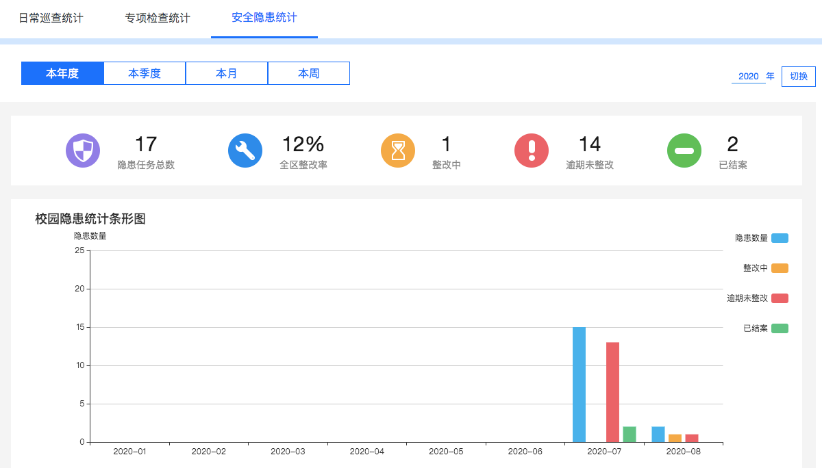 实行分级治理、分类实施的原则。隐患治理应做到方法科学、资金保证、措施有效、责任到人、按时完成。本部门能够治理的不能推给上级部门;能当场纠正的必须当场纠正,无法立即治理的,治理前要制定防范措施,落实管控责任,防止隐患发展成事故。管理人员通报隐患信息后、平台系统自动下发隐患整改通知、实施隐患治理、治理情况反馈、验收等环节,并在平台后端自动生成统计数据,按照年、季度、月、周进行数据统计,帮助学校在隐患治理方面进行数据分析。