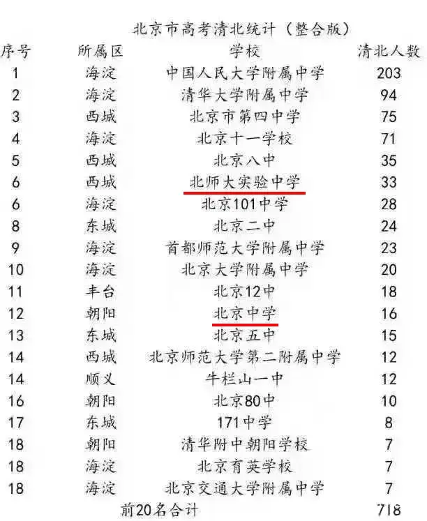 从表中可以看到,在西城的北师大实验中学和朝阳的北京中学,他们的清北录取总人数分别排在第六名和第十二名,这两所学校的清北人数为何不是最多,是不强吗?非也。这两所学校最顶尖的学生很多都放弃高考,走国外升学路线,去藤校牛剑等国外名校了;并且这两所学校的在校学生总人数远远少于那些超级中学,走的是短小精悍“小而美”的模式。