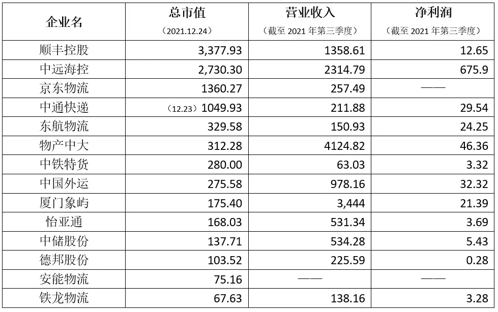 2021年,总市值突破千亿级的有四家物流与供应链服务上市企业:顺丰控股、中远海控、京东物流、中通快递。总结,快递物流市值最吸睛。