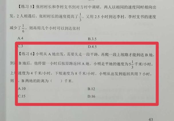 (考生回忆)原题:小明每天从家中出发骑自行车经过一段平路,再经过一道斜坡后到达学校上课。今天早上,小明从家中骑车出发,一到校门口就发现忘带课本,马上返回,从离家道赶回家中共用了1个小时。假设小明当天平路骑行速度为9千米/小时,上坡速度为6千米/小时,下坡坡速度为18千米/小时。那么小明的家距离学校(C)