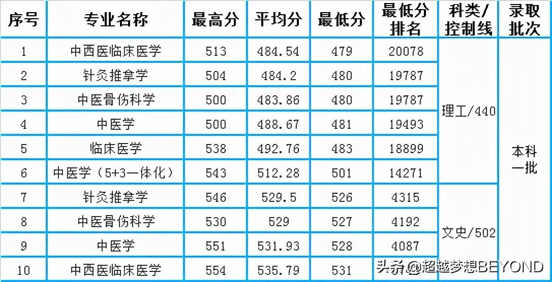 文史类专业录取最高分554分(中西医临床医学),录取最低分526分(针灸推拿学),最低分超过省控线24分,最低分位次4315,详见下表。