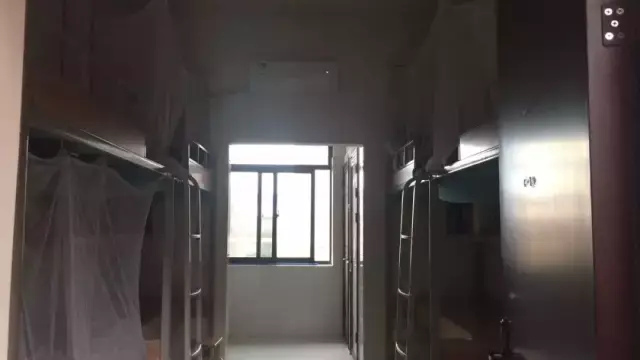 寝室环境不错,8人间,含独立卫生间,卫生间里面有两个淋浴、两个面盆和两个蹲位,房间有独立空调,每个人有直立衣柜专用。