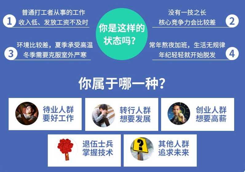 培养方向:理论学习与实训操作相结合的模块化教学模式,纯技能训练,专项焊工技术速成,能熟练掌握电焊、氩电联、焊条电弧焊、二氧化碳气体保护焊等的焊接技术,达到独立上岗操作水平。