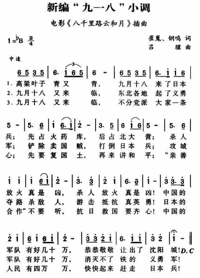 剧中描写从东北流亡到关内的父女俩在街头以卖唱为生,女儿用如诉如泣的悲声,唱出这首《新编九·一八小调》。这首歌的歌词朴素平实,呼吁不分党派,齐心救国。歌曲采用民间小调的形式,旋律委婉动人。