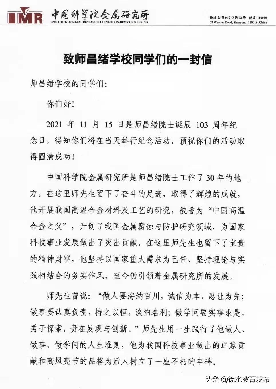 田海慧副校长宣读中国科学院金属研究所致师昌绪学校的一封信。
