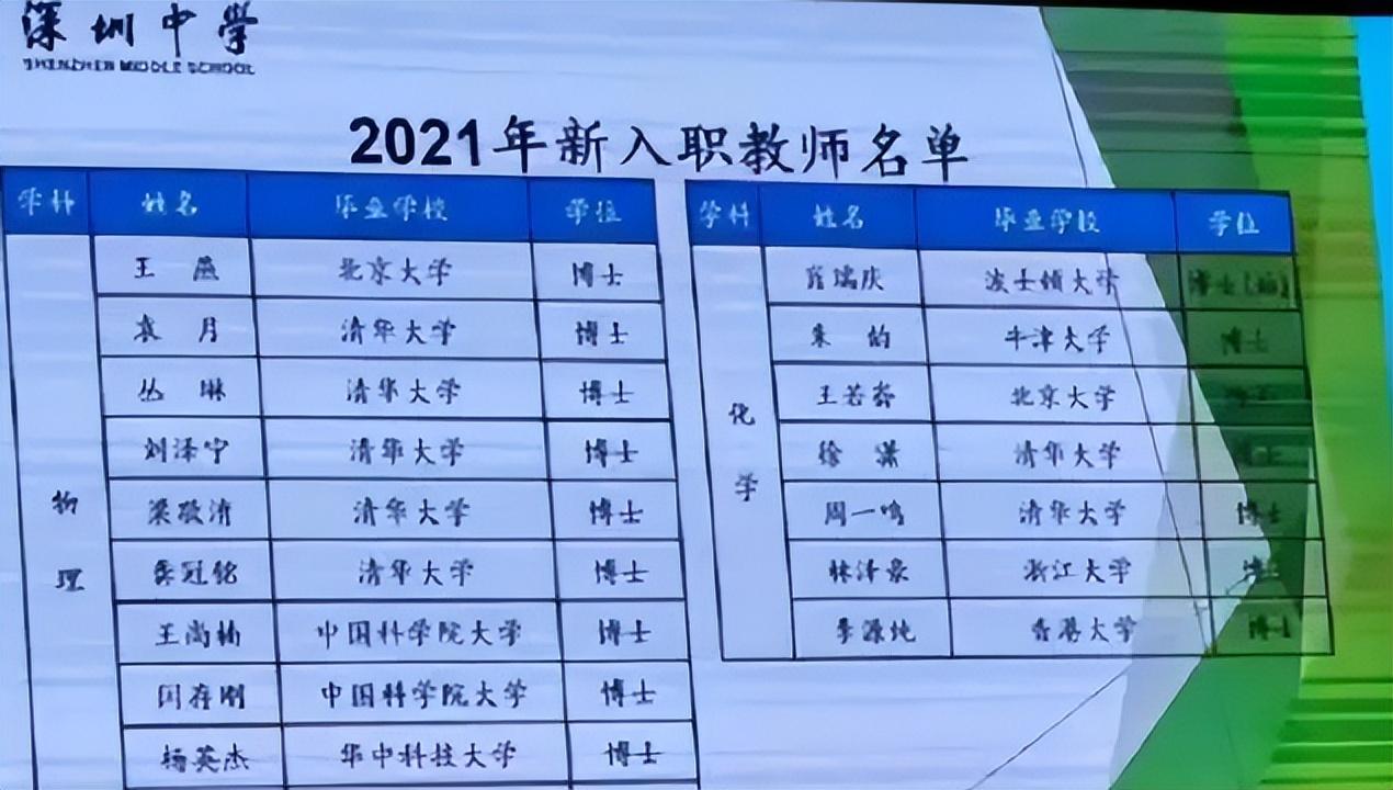 从2021年深圳中学公布的教师拟录取名单中就可以看出,在成功上岸的十余名准教师中,不乏清华、国科大、牛津大学等高等学府走出来的毕业生。