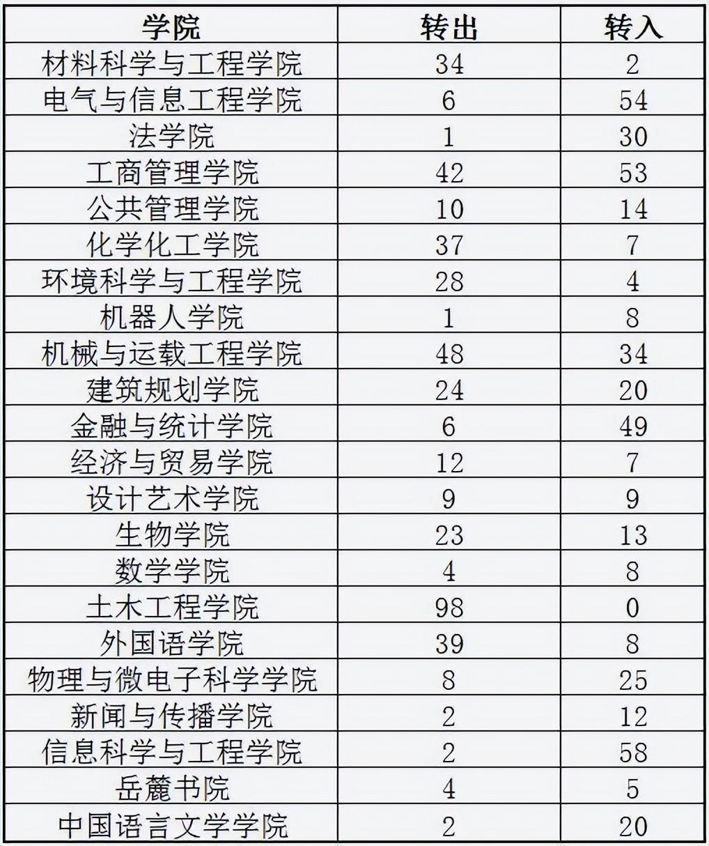 比如,湖南大学2021年转专业统计情况如下,我们可以看到,不同的专业转入与转出学生人数差异很大。