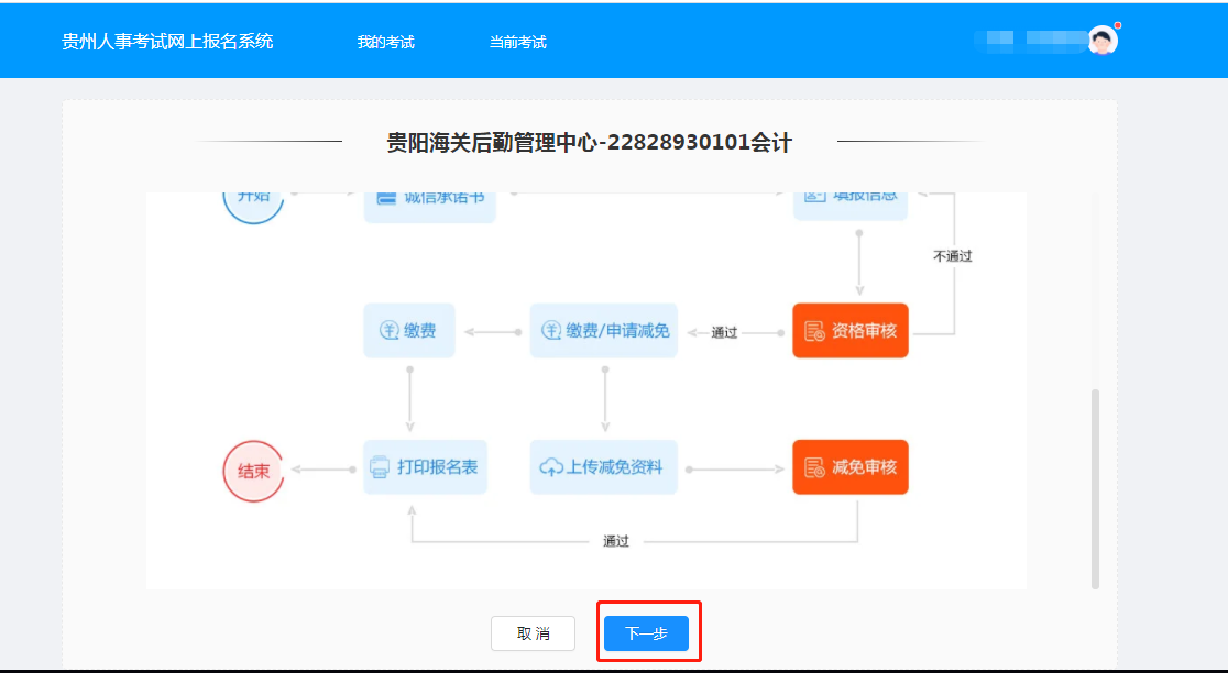 等待审核:考生“提交报名申请”后进入等待审核阶段,招考单位将在规定时间内进行网上审核,请考生在资格初审时间范围内及时登录报名系统查看审核结果。资格审核通过:一、审核结果为审核通过的考生,直接缴费完成报名,二、申请费用减免,上传费用减免审核材料进行费用减免审核,减免审核通过完成报名,减免审核不通过,正常缴费完成报名。报考省直考区、遵义考区的农村建档立卡人口、城乡低保对象和家庭经济困难的应届毕业生可免收考试费。报考其它考区的考生请致电咨询各地。省直考区0851—12333(转0<省本级>再转0<人工服务>)、遵义考区0851—23163875、安顺考区0851—33281804、黔南考区0854—8234166、黔西南考区(兴义市)0859-3915263