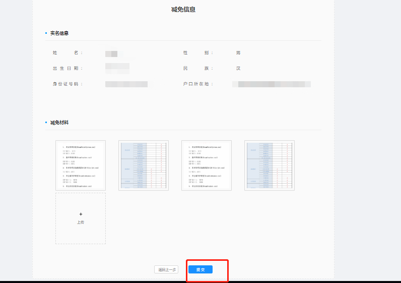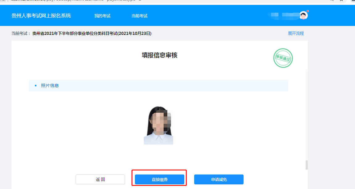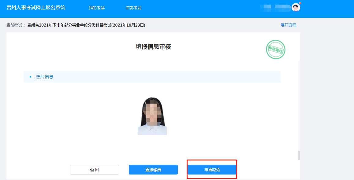 符合条件资格审核通过后点击【申请减免】按钮--按照系统提示上传审核材料--提交审核---审核通过,此时点击我的考试,下方你所报名考试显示“报名成功,请打印报名表”即为报名完成二、材料不全或不符合条件资格审核通过后点击【申请减免】按钮--按照系统提示上传审核材料--提交审核---审核不通过(退回缴费界面)。收到审核信息为“材料不全”,则可重新点击【申请减免】按钮,重新上传审核材料,等待审核。如审核信息为“不符合减免条件”则返回缴费界面点击缴费正常缴费。