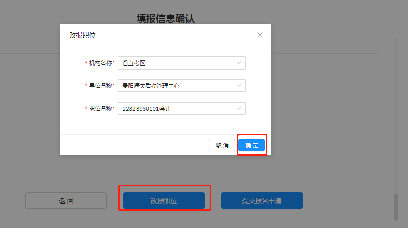 提交确认:所有报名信息填写完毕且所有材料上传完毕后请点击【下一步】,进入提交报名申请界面。点击【提交报名申请】按钮在弹出提示框内选择【继续提交】。报名确认后进入审核阶段。如需改报职位,请在提交报名申请前点击下方【改报职位】按钮,选择机构-单位-职位点击确认即可