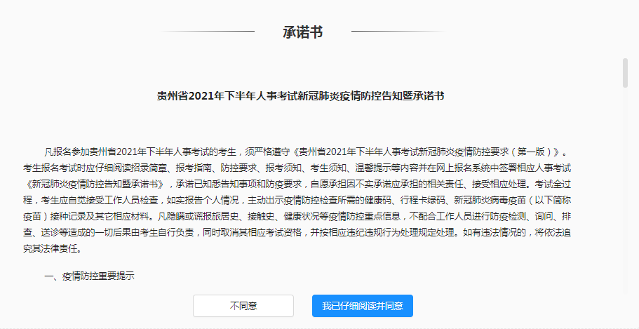 (5)阅读承诺书后点击“我已仔细阅读并同意”按钮继续报考。
