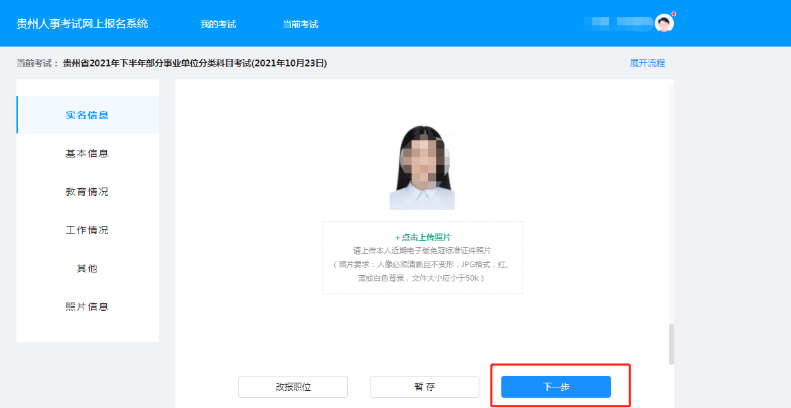 根据界面显示从上至下依次填写报考所需信息并上传照片(照片要求:本人近期电子版免冠标准证件照片(照片要求:人像必须清晰且不变形,JPG格式,红、蓝或白色背景,文件大小应小于50k)。填写完毕后点击下一步。
