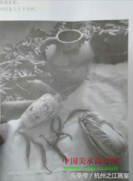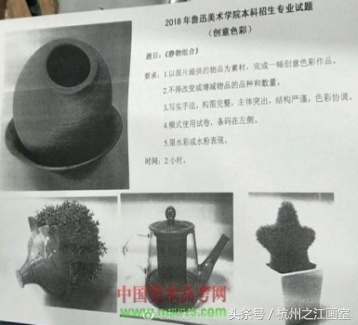 静物默写,一个黑色茶杯,一个插绿萝的浅色瓷瓶、四种水果(数量不限)、白色衬布一块,8开画纸,考试时长3小时。