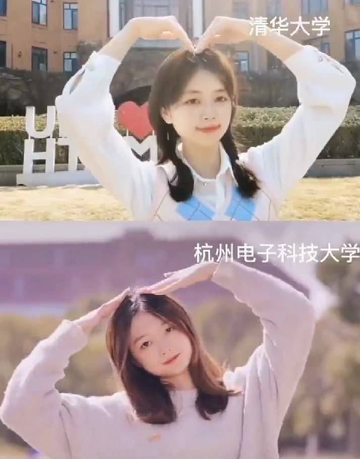 下图中的是清华大学和杭州电子科技大学的两位校花的手势舞截图,如果说其中一位是学霸,那另一位绝对就是考神了。实话实说,两位在颜值上与前几名是有些差距的,不过评判校花的标准如果只在颜值上,那可是十分肤浅的。