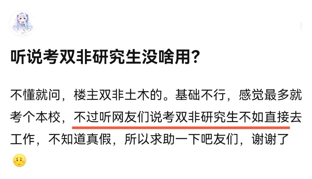 比如,下面这位土木工程专业的同学,就正在犹豫,到底要不要考“双非”大学的研究生?