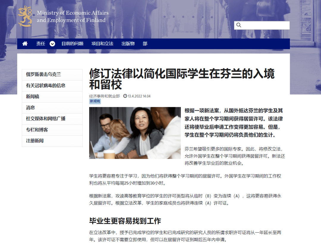 根据芬兰政府规划,预计2030年,将工作型移民数量至少翻一番;与此同时,国际学生数量增加两倍,达到每年15000名,并争取其中的75%在毕业后留在芬兰工作。