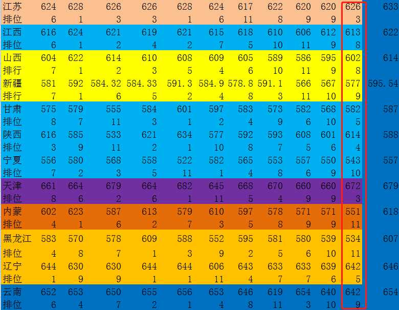 当然,除了表现好的省份,电子科技大学在黑龙江、内蒙古、以及广西等省份受到了冷落,在12校中排在最后一位。其中,在黑龙江的投档线仅为534分,在内蒙的提档线为551,提档分相对较低;而在广西,其投档小高达614分,但是由于其他11校的提档线水涨船高,因此相对排名较低。