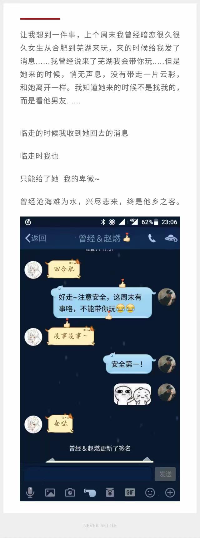 毕业之后,向你表白的时候被你拒绝了,你当时说的是,我现在不想谈,其实我把你当朋友的,其实那一刻我什么都知道,可怜了我的单相思,把你删了是我目前为止做的最心痛的事情,你发的说说,全都是在骂我,你的态度也有点心灰意冷,,,那个时候的扣扣不像现在一样,大家都能访问陌生人的空间,我没事就过去看看,每天都去浏览,知道你读了实验,而我果断的去了三中,你说我选了三中你才选了实验,其实刚好相反,因为初中我只考了四百多分,本来去合肥读三加二的大专的,后来我妈说花钱给我买,买实验和三中的价格其实也差不了多少,你去了实验后,我还是义无反顾的去了三中,那暑假的两个月我没去上班,每天浑浑噩噩的过着,每天晚上都能梦到你,那个时候的我真的跟死了一样,