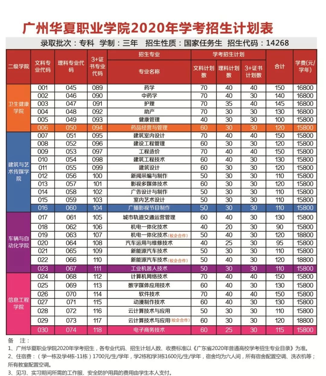 广州华夏职业学院是经广东省人民政府批准成立、教育部备案的民办全日制普通高等学校。由华夏教育集团,广州乐欣投资有限公司投资创办。于1989年成立,前身为广东涉外商务技工学校,2009年更名为“广州华夏职业学院”,并设立大专。2020年3+证书招收计划公布,初步共招收1420人;该校在第一次录取都无法完成招生计划,需要补录;学费15800-16800元/学年(不含住宿费)。