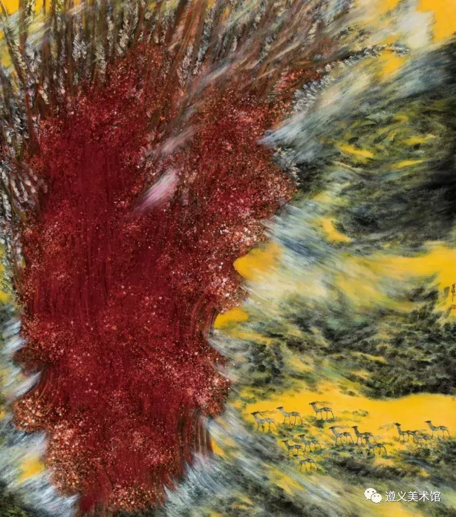 作品简介:“祥光”是经历时光筛选所留下的最精彩的瞬间,昭显着生命的华章,剥离了粗糙,萦绕着浪漫。富有诗意地书写了“红色革命胜利”之美好——云雾笼绕,红色古木参天,普天之下一片祥和美好的福地。表现出了一种静穆和圣洁,导引人们升腾起一种历经沧桑后不忘初心的感动,在这感动中使我们的心灵与之升华。