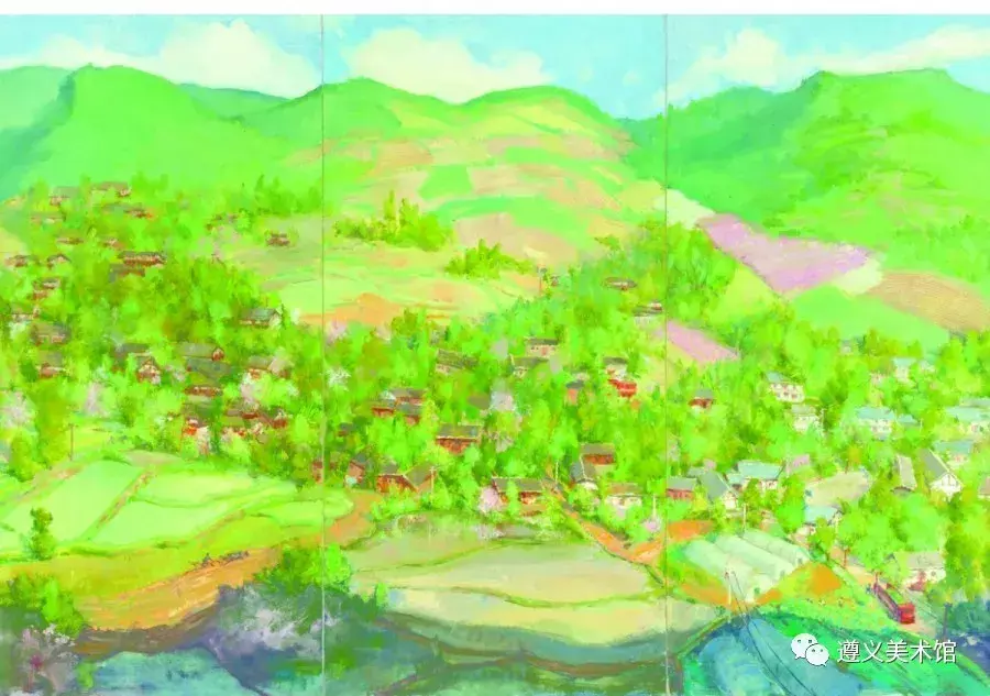 作品简介:以遵义乡村改革开放来的变化为主题,讲述大山里的乡村历史的变迁和新农村的建设。第一联,改革开放初期,遵义乡村多数百姓把家安在山坡上,甚至是靠近山顶。第二联是反映上个世纪八十年代末和九十年代初期农村建设,许多家庭逐渐在交通便利一些山脚或山腰修建红砖房和青砖房。第三联,遵义市在2016年后开展了“富、学、乐、美”为主题的“四在农家”建设,农村建设发生了巨大的变化,这是一幅乡村变迁的画卷。
