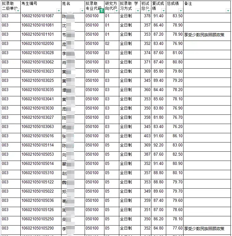 2021年中国语言文学拟录取共32人(其中享受少数民族照顾政策4人),初试最高分403,最低分337,平均分359.4;