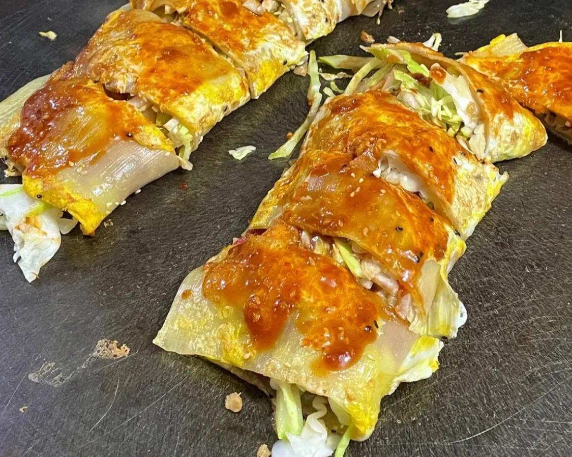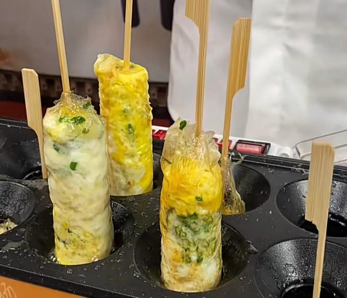 最近流行起来的蛋包肠,把火腿肠放进机器里,再打入一个鸡蛋,就可以了,卖3元一个。