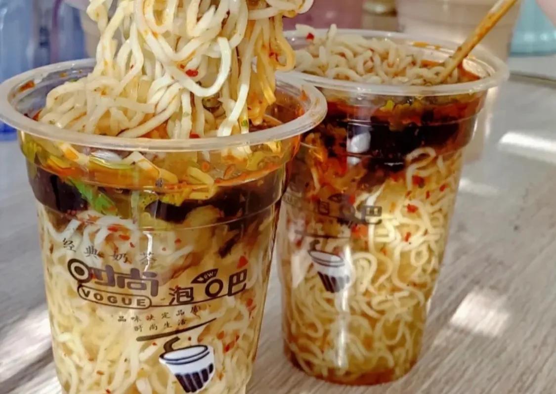 用奶茶杯来装面,味道嘛,就跟泡方便面一样的感觉。