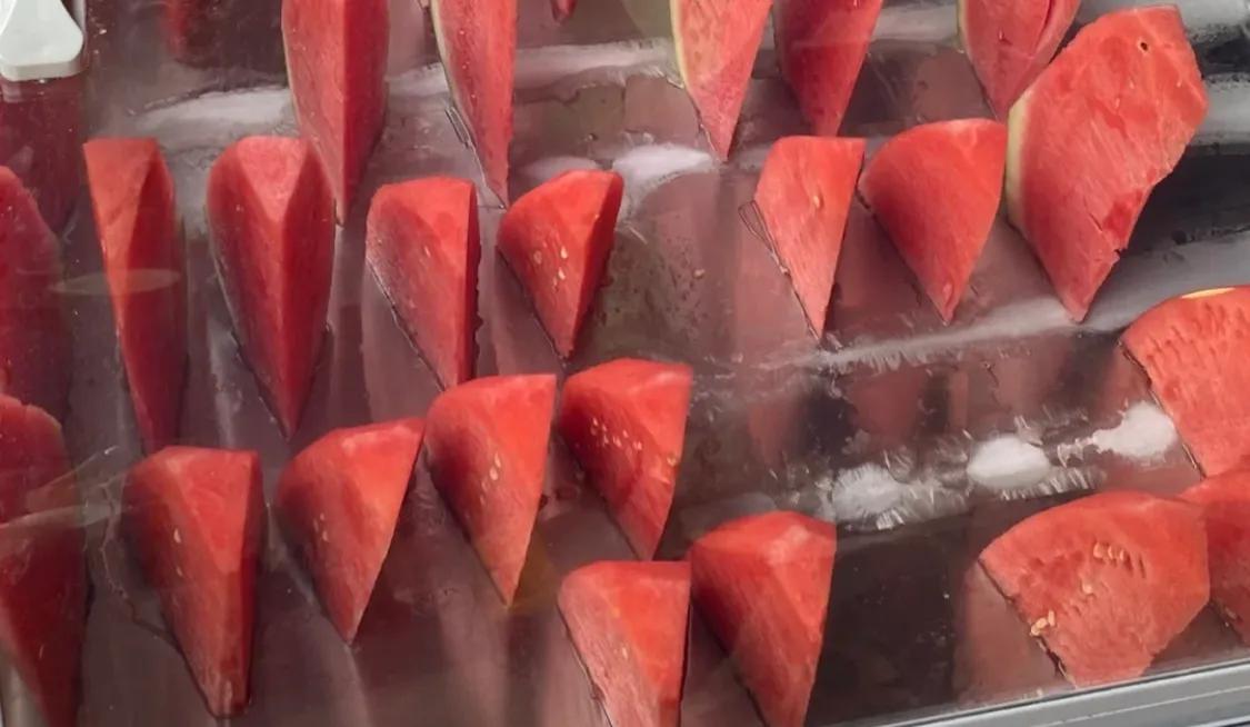 学校门口的西瓜大多数都是切成一块块,然后去皮卖的,买来吃很甜,三元一块。