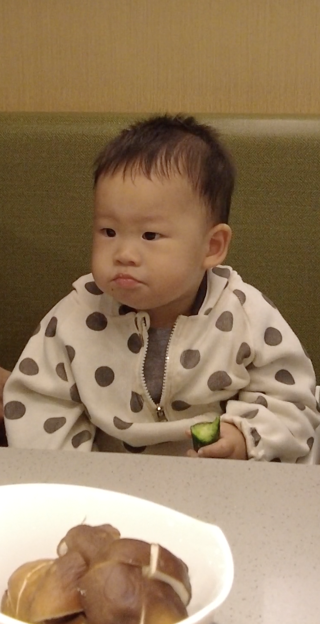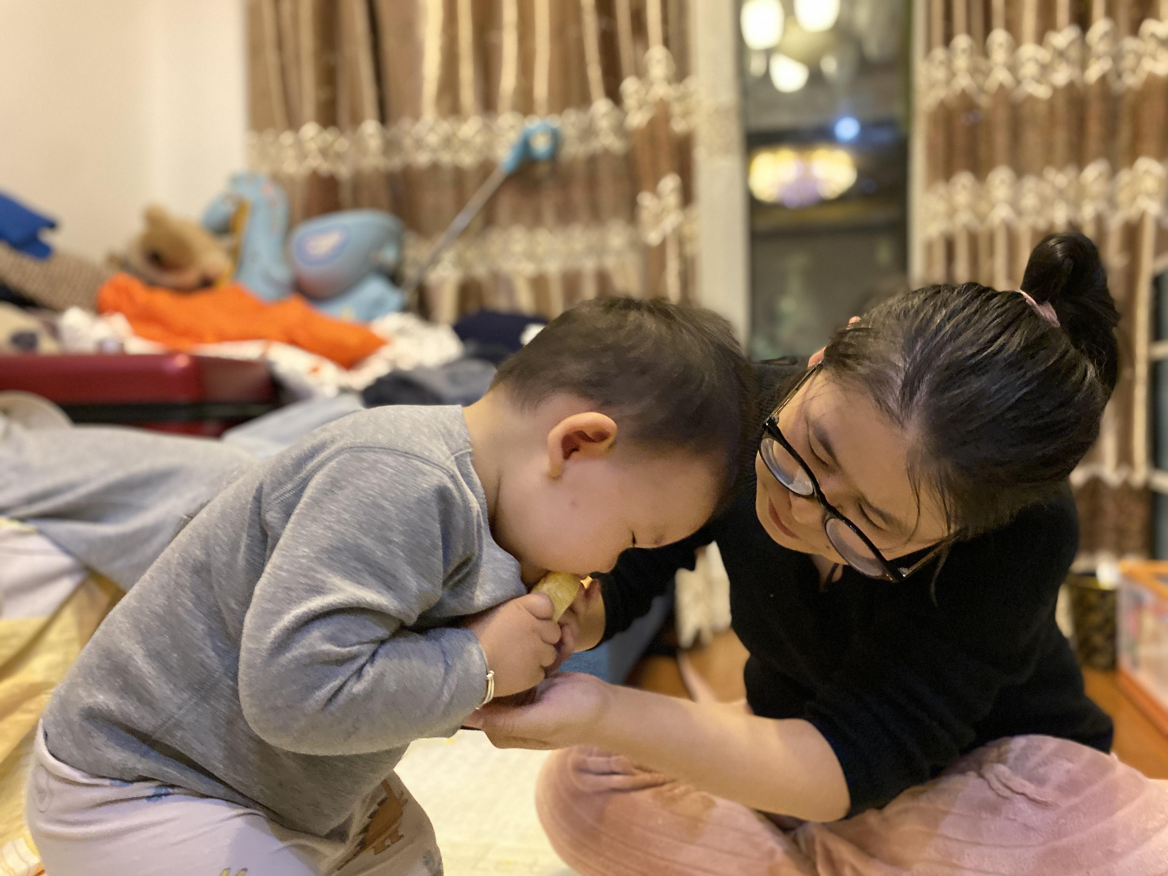 我们这周也给他尝试了其他的新的食物-大蒜叶和蛋挞。大蒜叶不幸的过敏了,吃了几口就很快脸红了,不敢再继续喂了。