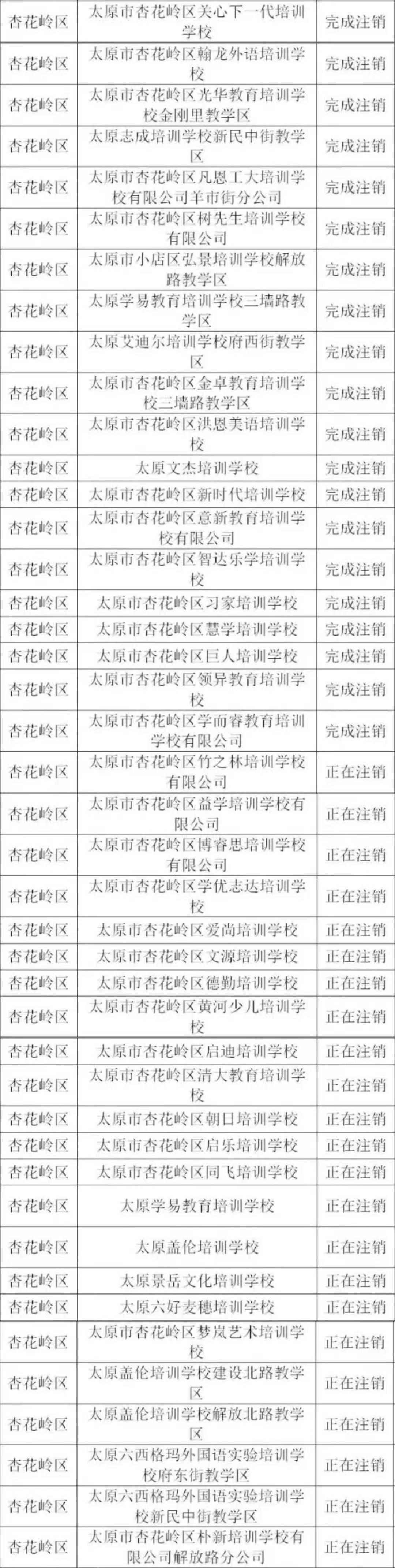 1月6日,太原市教育局官宣,根据国家“双减”工作要求,为全面规范学科类校外培训机构办学行为,第二批新注销71家培训机构,情况公布如下——
