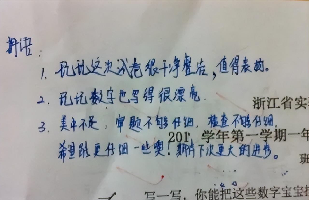 这位家长更加严谨一些,还标注了序号。先是表扬了学生卷面干净整洁,字迹也很工整漂亮。但是后面也提到了美中不足的地方,因为审题和检查的不够谨慎,有一些地方不应该丢分。相信在家长这样认真的检查下,以后学生马虎的毛病一定能改掉。