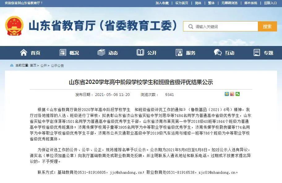 据介绍,为保证评选工作的公开、公平、公正,省教育厅将推荐名单予以公示。公示期为2021年5月6日至5月8日。如对公示人选有异议,要实名(单位须加盖公章)向省教育厅基础教育处或职业教育处反映,并注明联系人通讯地址和联系电话。过期或不按要求提出异议的,不予受理。联系方式:基础教育处0531-81916605,jjc@shandong.cn;职业教育处0531-81916538,zjc01@shandong.cn。