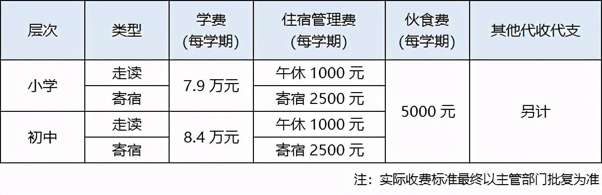 小学8.8w/年,中学12.8W/年(不含餐宿费)