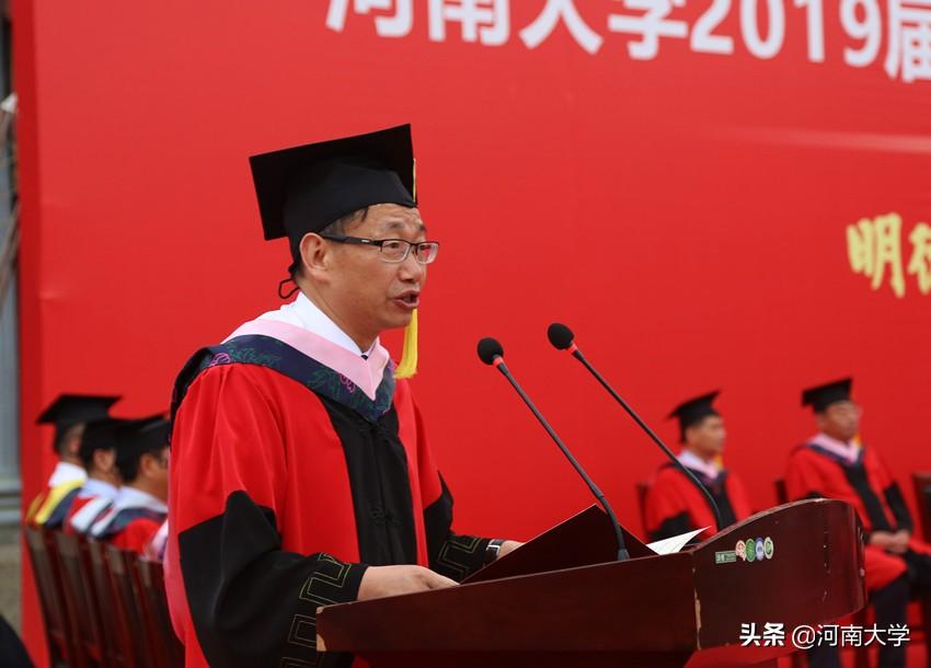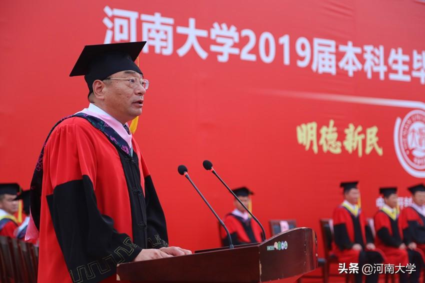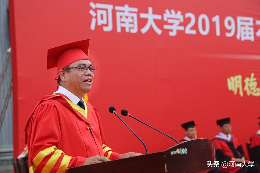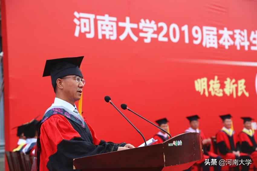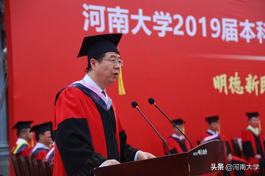 “光阴荏苒,岁月不居。几年来,你们用最宝贵的青春,与河南大学演绎了一场美丽的相遇;河南大学用最丰厚的文化,与你们创作了一场经典的传承。”卢克平娓娓道来的话语,如春风化雨般吹进每一位毕业学子的内心深处,勾起他们对母校深刻的记忆和无限的眷恋。他引用电影《老师·好》中的一句话表达出了作为师长对即将离开母校的学生最真挚的告白:“人生就是一次次幸福的相聚,夹杂着一次次痛苦的别离,我不是在最好的时光里遇见了你们,而是遇见了你们,才给了我这段最好的时光。”言之殷殷、情之切切,让现场同学深深为之动容。欢笑与泪水、激动与不舍、回忆与期待,万千心绪都交织在了这情深似海的毕业典礼中。