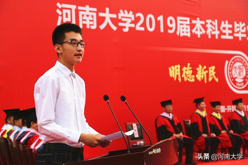 “毕业的你们,我们的榜样。”2018级历史文化学院王悦同作为在校生代表发言,表达了对毕业学长学姐的感谢和祝福。“相聚又别离,离帆又归岸。”他说,河大见证了每一位毕业生的情感与梦想、青春与成长,祝福所有河大人越走越远,也欢迎他们常回家看看。