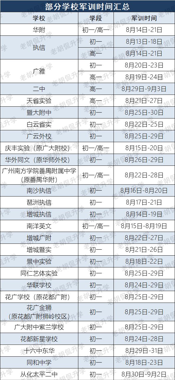 根据安排,执信初一军训时间为8月13-18日,高一军训时间为8月14日-21日。