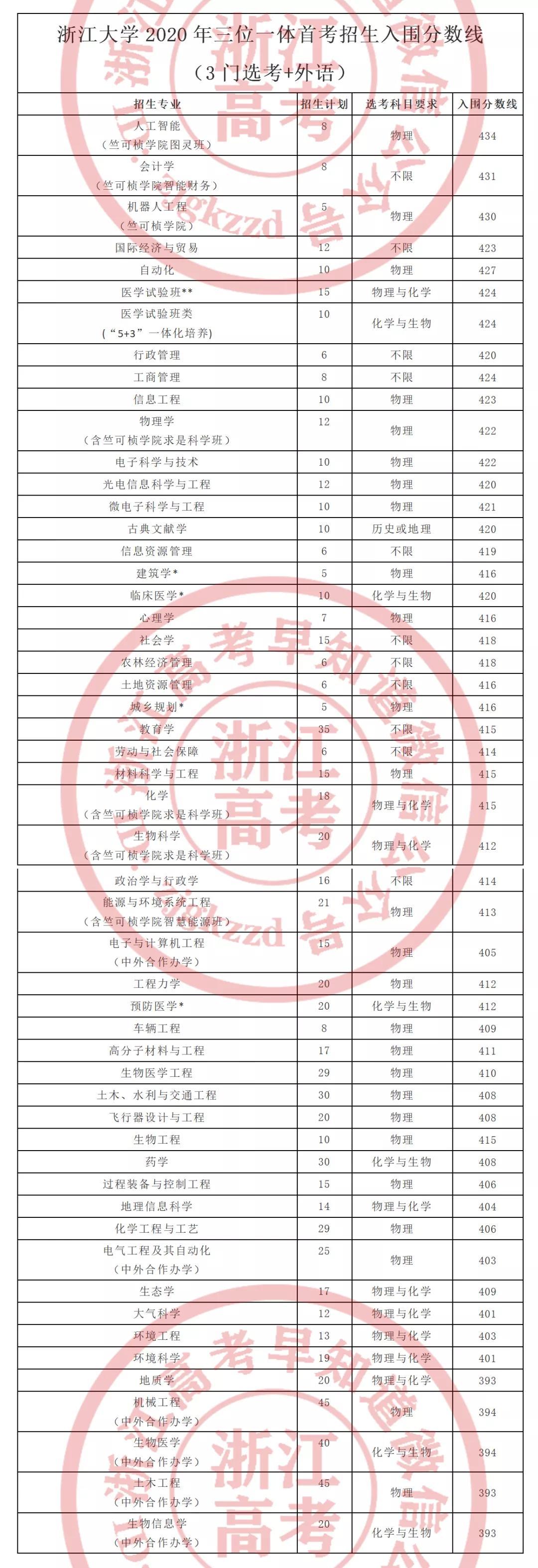 (以上数据来源《浙江大学2020年浙江省“三位一体”综合评价招生简章》,2021年以招生简章为准)