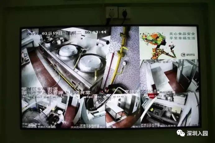 在厨房门口,随处可见幼儿园的规范管理,墙上张贴着食品安全信息公示及各项安全制度,还有24小时开启的监控视频。