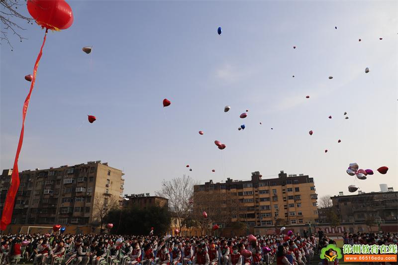 学生代表发言结束后,八、九年级学生放飞许愿气球,寓意放飞自己的梦想。